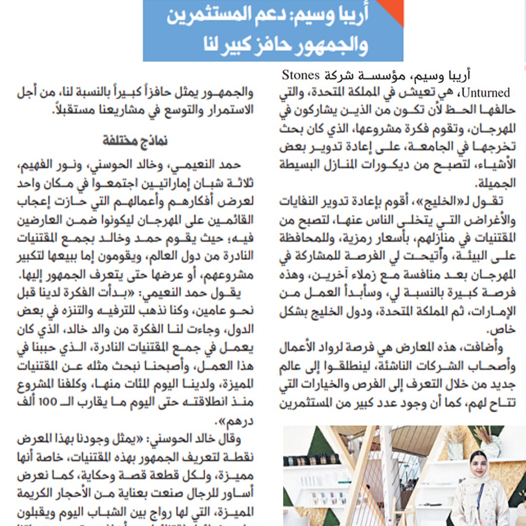 One of the key milestones for Unturned Stones was its participation in the Sharjah Entrepreneur Festival in 2022. The business made waves during the festival, captivating the audience with its innovative approach to sustainability. An article featured in Al Khaleej Newspaper highlighted the distinctive work of Unturned Stones, bringing attention to its use of sustainable materials and its commitment to environmental responsibility.