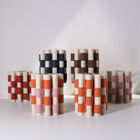 Carved from upcycled stone, each cylindrical pillar stands as a quiet monument to permanence and earth. These stone forms are bound together by eco silicon leather loops, meticulously wrapped to create both structure and softness. The looping bands echo traditional weaving techniques found across the region, once executed with palm fronds and natural fibers, now reinterpreted through modern, ethical materials.